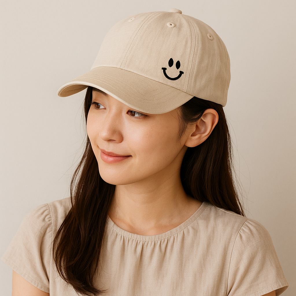 サイドにスマイル刺繍をあしらった、シンプルで柔らかい雰囲気のキャップ。